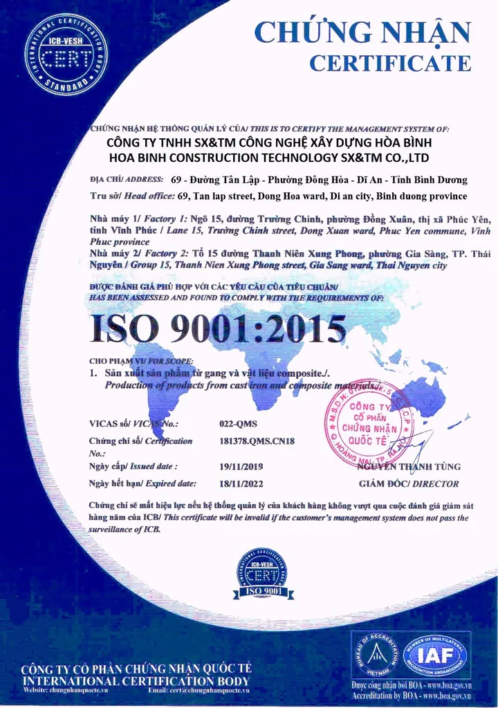 Các chứng nhận của Công ty TNHH sản xuất và thương mại công nghệ xây dựng Hòa Bình - Hòa Bình Group