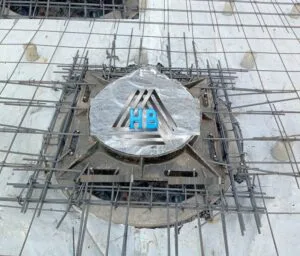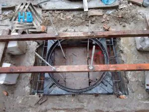 Gia cố thêm các cọc thép bẻ cong đầu vào các lỗ chờ của khung nắp hố ga. Có thể cân nhắc gia cố thêm các khung thép tròn.