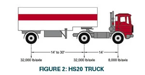 Tải trọng xe tải được sử dụng lần đầu tiên có ký hiệu H20 (xem Hình 1), bao phủ một chiếc xe tải hai trục nặng 20 tấn. Trục trước mang 8.000 pounds và trục sau, cách 14 feet, mang 32.000 pounds. Phiên bản năm 1944 bao gồm tải trọng xe tải HS20 và bắt đầu chính sách gắn năm với tải trọng làm cho HS20-44 trở thành chỉ định chính thức. Các ‘S’ bổ sung đã tạo ra một khoản phụ cấp cho các xe đầu kéo nặng hơn có sẵn tại thời điểm đó.