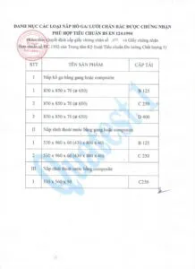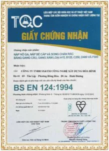 - Chứng nhận phù hợp tiêu chuẩn BS EN 124:1994 là một chứng nhận quan trọng cho các nhà sản xuất và nhà cung cấp sản phẩm nắp hố ga gang cầu và cấu kiện cống thoát nước.